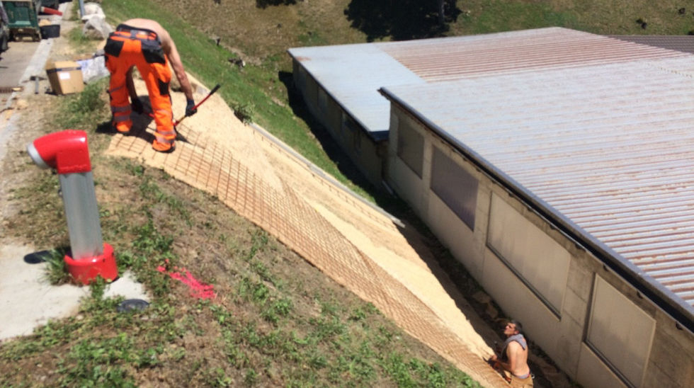 Grün-Fix – un treillis en acier solide et complet avec une densité de 10 × 10 cm – est monté sur la pente en question et tendu dans le sol jusqu'à deux mètres de profondeur avec des ancres.